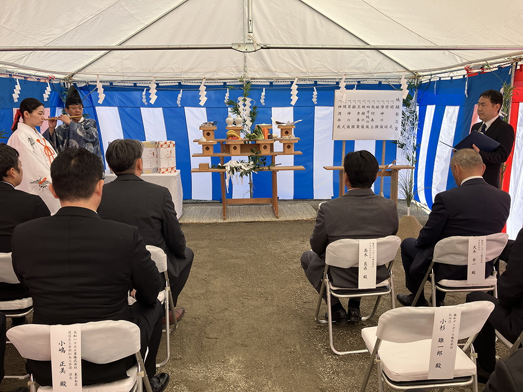 冬晴れの良き日に地鎮祭を執り行い、関係者皆で無事の完成を祈祷しました。
