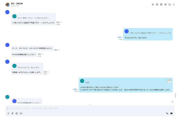 製造部のメンバーは現場や事務所など複数の場所で業務を行うため、口頭や電話だけでは伝達のタイミングが合わず、行き違いが起きることもありました。