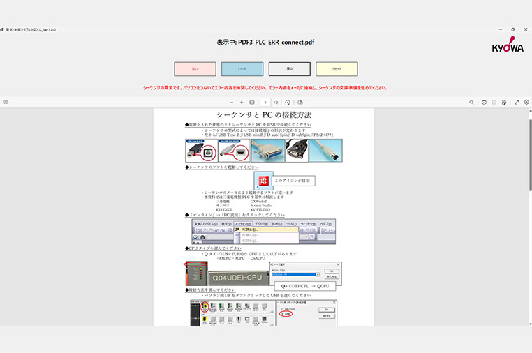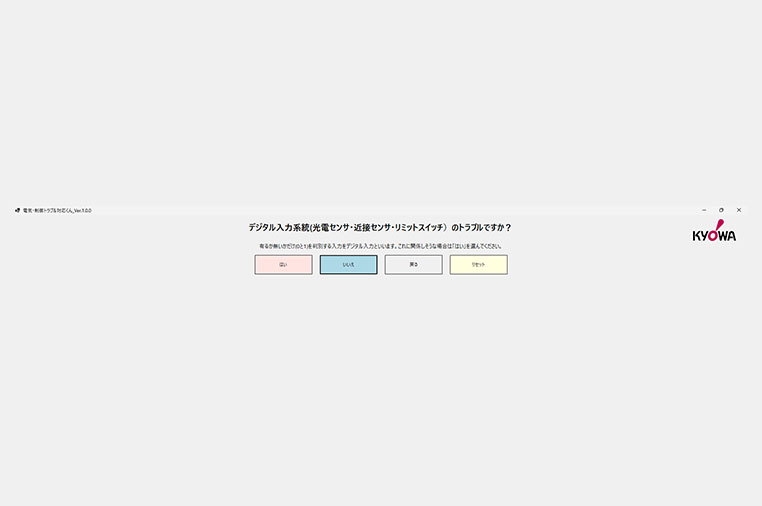 質問に対して「はい」「いいえ」で回答していくことで、「次に確認すべき箇所」や「対応の手順」を案内する仕組みです。